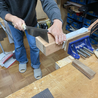 ボディとの間に隙間が出来ないように、センターラインを崩さないように、ボディ上部と高さが揃うように、と3次元に気を配った作業です。鋸で少し大きめに作った部分を鑿で薄く削っていき、ピッタリ合うところまで加工します。