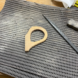 持ち手は欅で作ります。ウクレレ指板材の端材がありましたのでそれを使います。6mm厚です。まずは設置位置に仮止めして形を検討⇒穴あけ⇒成形という感じです。