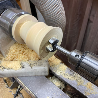 ある程度形が出来たら芯押しを外し、不要部を取り除きます。今回はマグカップですから、中をくりぬきます。まずはビットを使って穴を掘ります。